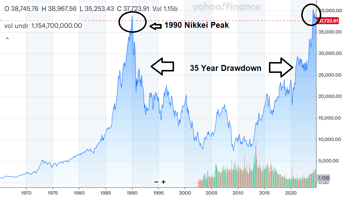 A long-term chart of the primary Japanese stock index, the Nikkei 225, is even more eye-opening. While our central bankers haven't been as aggressively creative as the Bank of Japan, they have employed many of the same tactics. The Nikkei 225 exploded higher in the 1980s to peak in 1990 at just under 40,000, a level that wasn't seen again until this year (almost 35 years later).