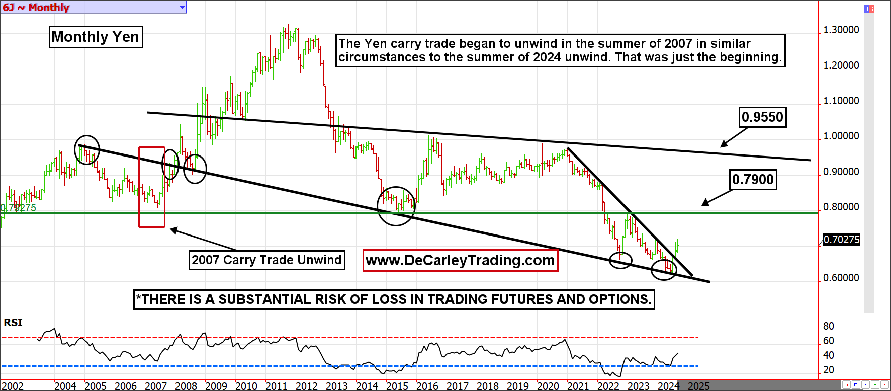 • The most obvious comparison is the unwinding of the yen carry trade, which lit the fire for the financial crisis fire in 2007. The equity market corrected immediately but never fully recovered its uptrend and eventually experienced a 50% correction. We are currently in the 2nd or 3rd inning of the game, so we don't yet know if this is a replay.
