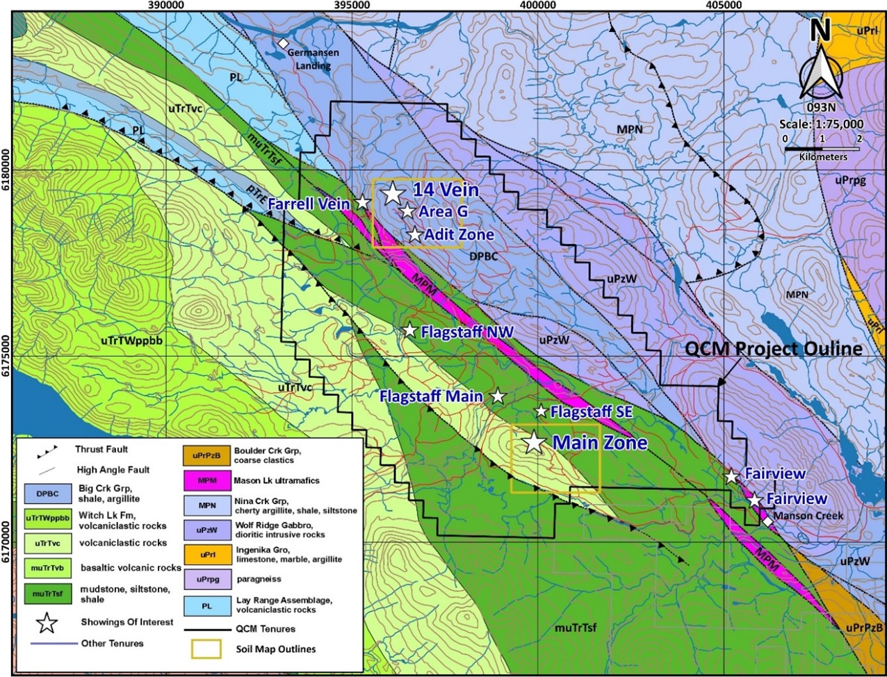 QCM is comprised of 8,729 hectares covering an approximate 15-kilometre strike length of the Manson Fault Zone which is thought to be a controlling structure for much of the gold mineralization in the district.
