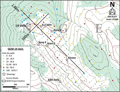 Pat Lynch, President and CEO of Kestrel, states: "We are pleased to see Centerra continue to make quality progress at QCM. The identification of a 1.8 kilometre long by up to 500-metre-wide gold in soil anomaly encompassing the 14 Vein showing suggests strong size potential for this target. We are also excited to see a 550-metre expansion of the gold in soil anomaly overlying Main Zone. Overall, work continues to support our belief that QCM is host to several large-scale gold targets and we look forward to results from the soon to commence drill test of these targets."