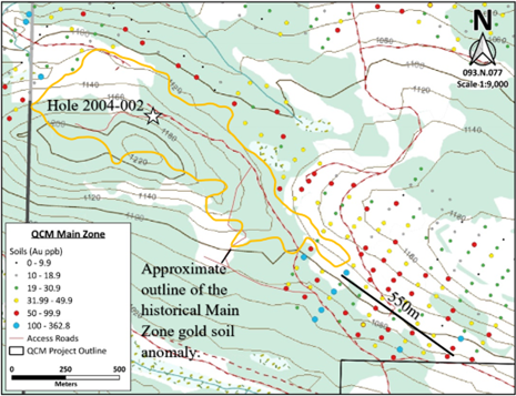Peak values from historical drilling completed within the Main Zone were found within hole 2004-002 which intersected an interval of 2.86 g/t Au over 110.95 metres, including a high-grade interval of 173 g/t Au over 1.5 metres, true widths unknown.