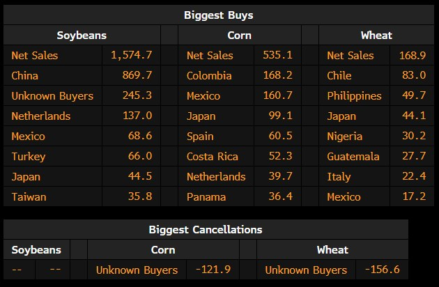 - Corn: Net sales of 535,100 MT (21,065,950 bushels) for 2024/2025. This was below the low end of expectations.