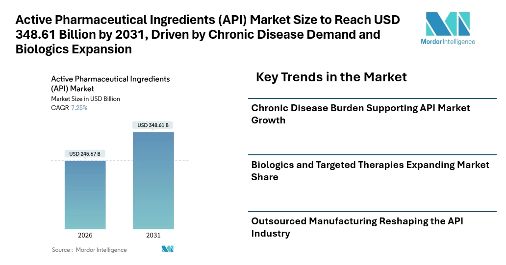 According to Mordor Intelligence, the active pharmaceutical ingredients (API) market size is estimated at USD 245.67 billion in 2026 and is expected to reach USD 348.61 billion by 2031, registering a CAGR of 7.25% during the forecast period. The active pharmaceutical ingredients (API) market continues to expand as healthcare systems respond to aging populations, rising chronic disease prevalence, and sustained approvals of complex biologics.
