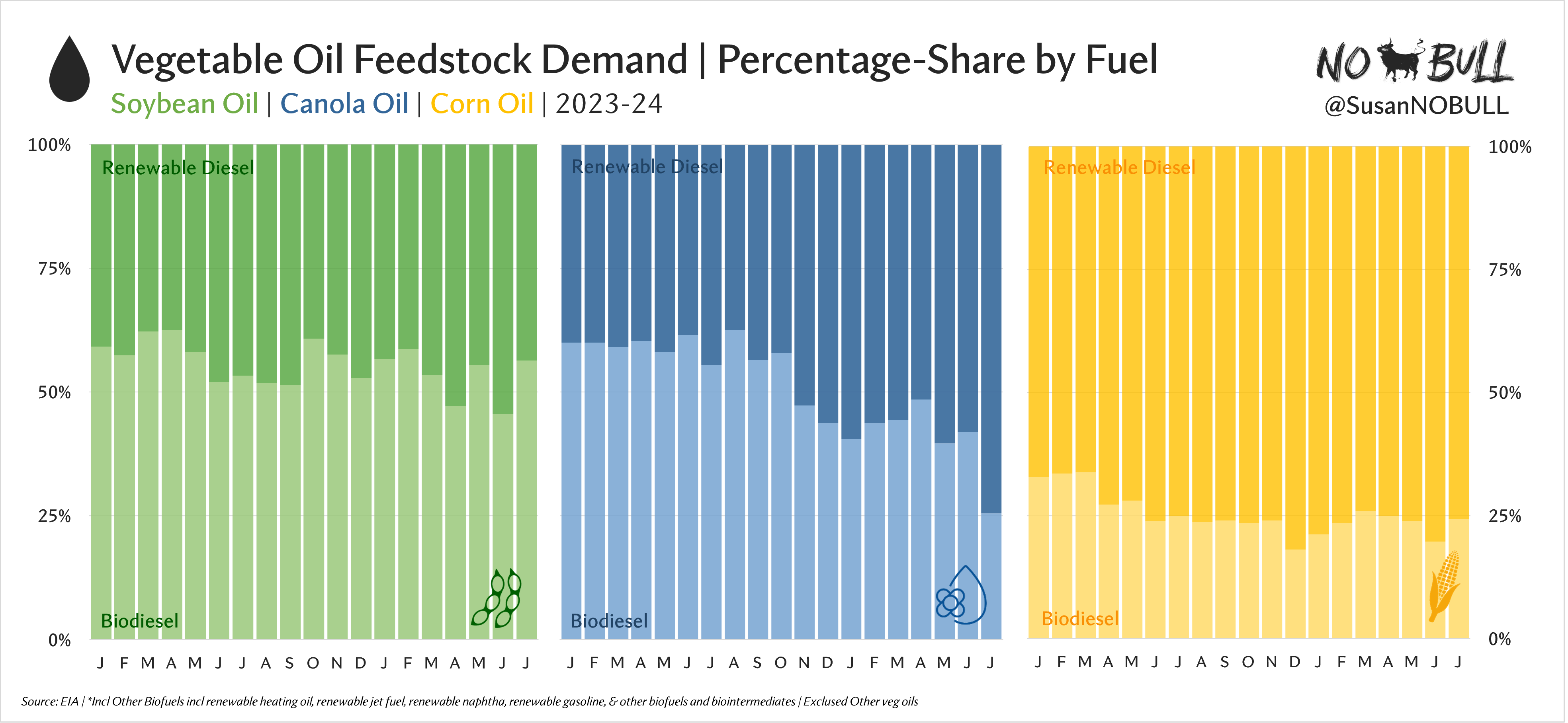 Interesting to compare the three major veg oils used in biomass-based diesel production by fuel.