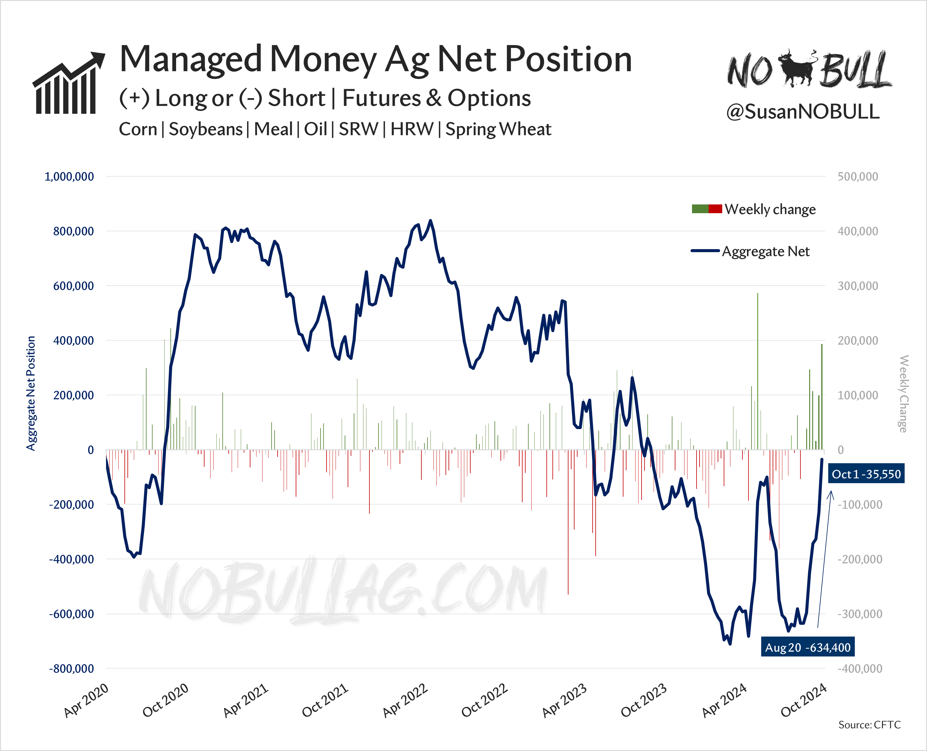 The week ending Oct 1 was the largest week of buying across ags since early May, lifting the aggregate corn + soy complex + wheat net short to its smallest since September of last year.