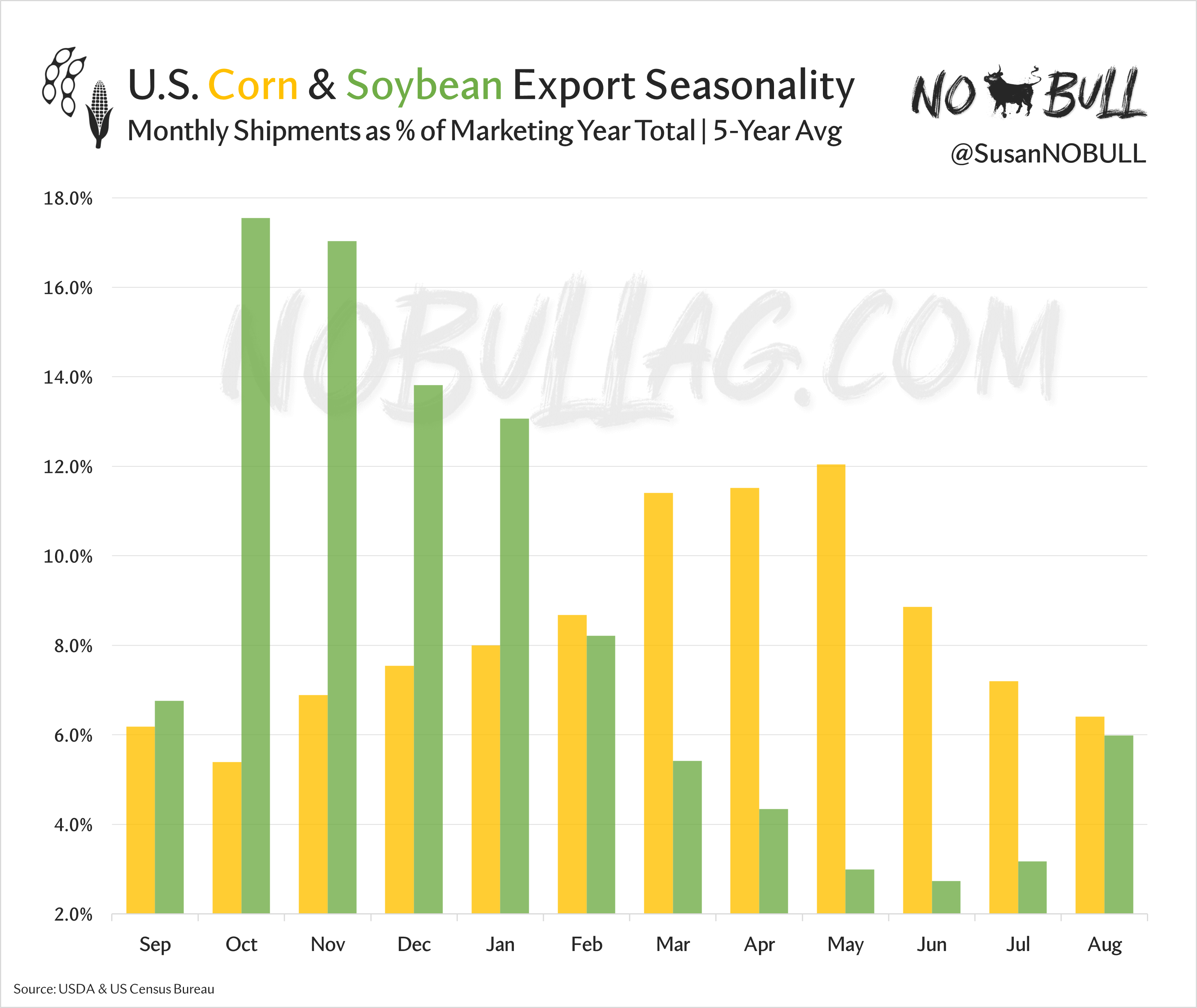 Soybeans dominate the first half of the marketing year before corn exports ramp up into the winter and spring months: