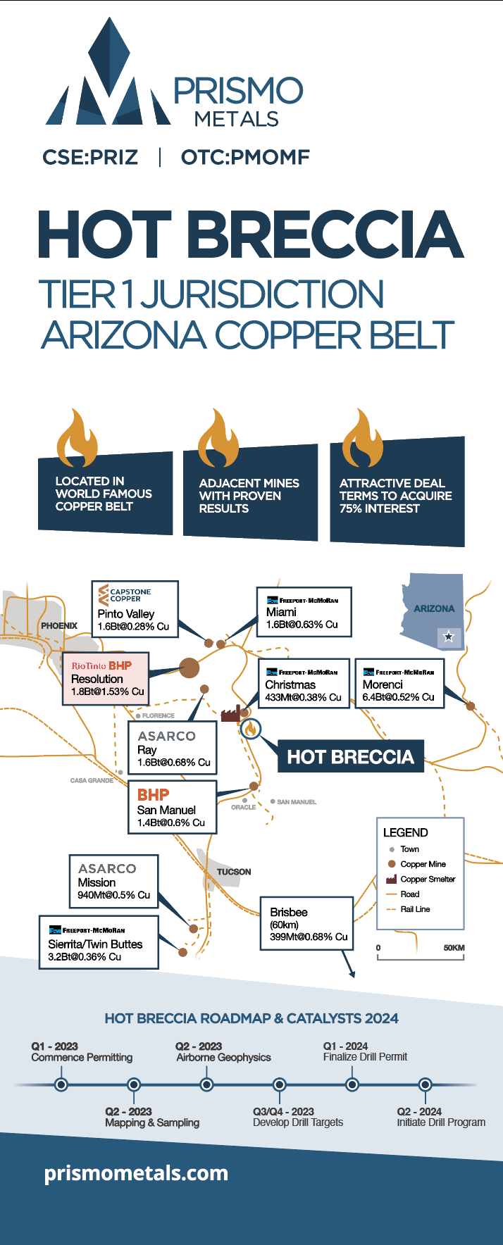 The Hot Breccia property consists of 1,420 hectares in 227 contiguous mining claims located in the world class Arizona Copper Belt between several very well understood world-class copper mines including Morenci, Ray and Resolution (Figure 3). Hot Breccia shows many features in common with these neighboring systems, most prominently a swarm of porphyry dikes and series of breccia pipes containing numerous fragments of well copper-mineralized rocks mixed with fragments of volcanic and sedimentary derived from considerable depth. Prismo performed a ZTEM survey last year that identified a very large conductive anomaly directly beneath the breccia outcrops.