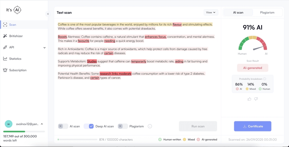 Previously, the system provided an overall AI score for each text and sentence-level probabilities. The new functionality goes further by highlighting individual words that influence detection results, giving users greater clarity and transparency.