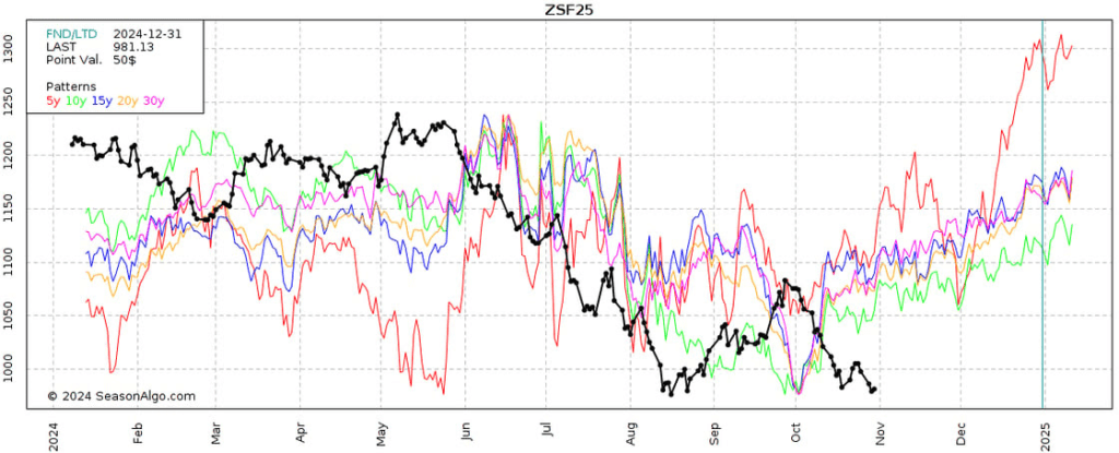 Below is a look at historical price averages for March corn futures on a 5, 10, 15, 20, and 30 year time frames (Past performance is not necessarily indicative of future results). The chart seems to indicate that November can be a tough time for the market to stage a meaningful rally. Whether or not that plays true this year is TBD.