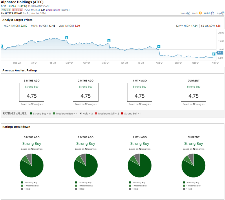 Despite the massive post-earnings rally, ATEC is still down 53% from its year-to-date highs, and trades more than 59% below its 2021 highs. Analysts seem unbothered by the stock's freefall in 2024, with 11 out of 12 ranking the stock a “buy” or better, and the mean price target of $17.46 implying expected upside of more than 115% from Friday’s close.