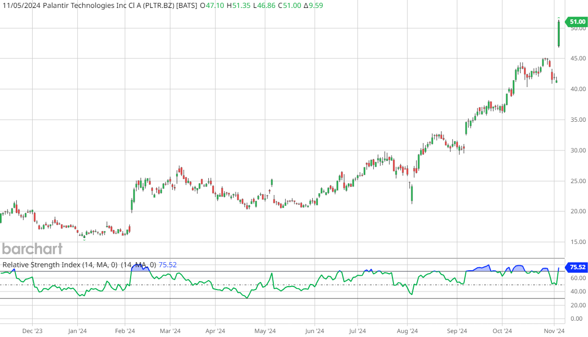 Palantir Technologies (PLTR) gapped higher at the open today, and rallied to new record highs following its third-quarter earnings report. The company reported a 30% year-over-year revenue increase, driven by strong demand for its artificial intelligence (AI) solutions, particularly in the U.S. government and commercial sectors.