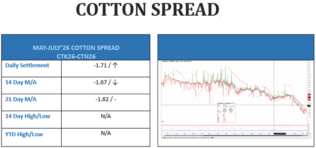 The CTK26-CTN26 (MAY-JULY ’26 COTTON SPREAD) has been hovering just below the 14-day and 21-day moving averages for about a month-and-a half. It has recently started to touch the 14-day and is getter close to the 21-day as well.