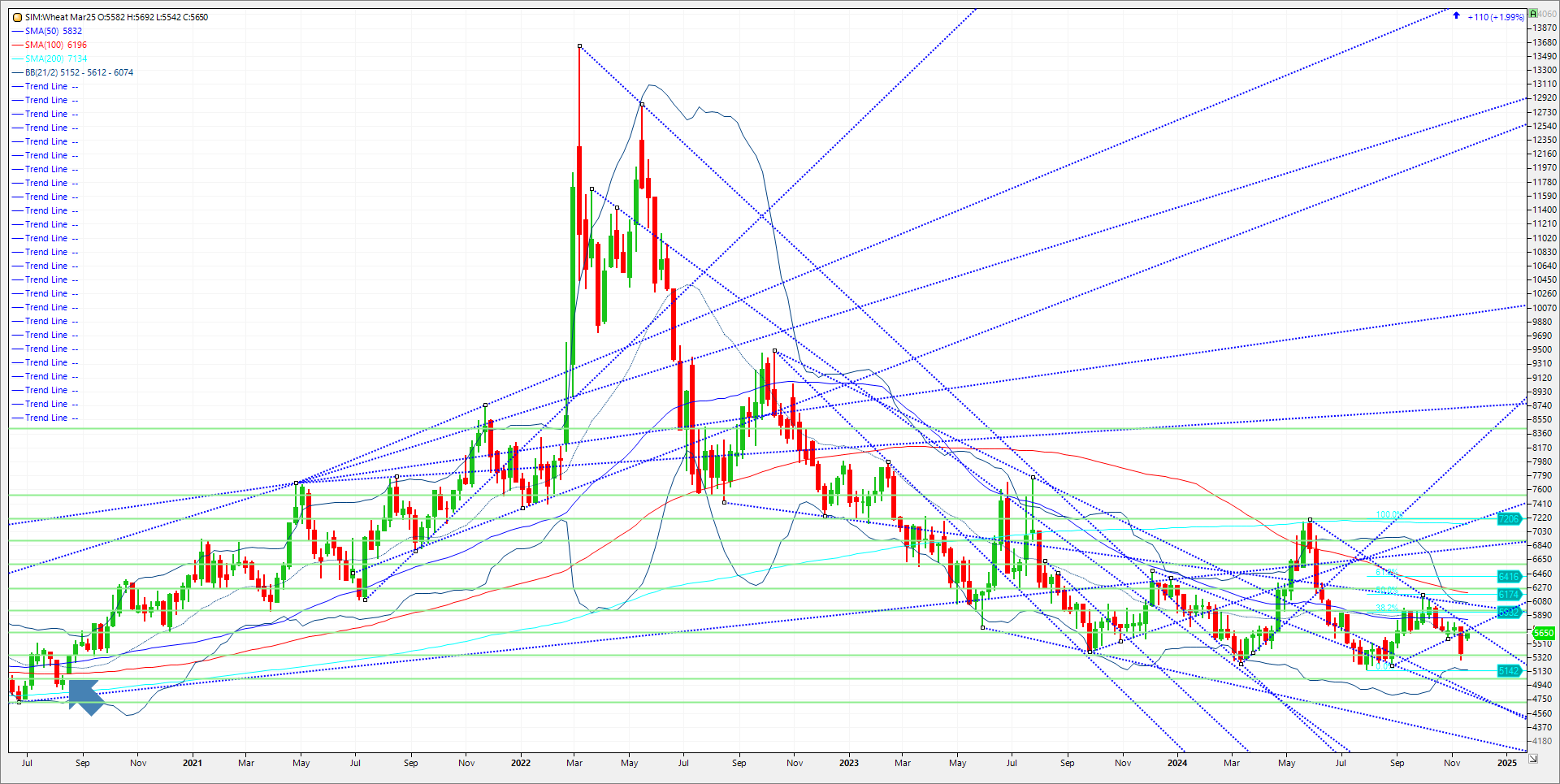 Wheat prices are leading to the upside today after the Biden administration announced Ukraine can use long range missiles against Russia. Russia responded to the decision by launching a massive drone attack overnight targeting Ukraine's power infrastructure. Ukraine's government suggests they have lost 18% of their agriculture growing area due to the war. As with previous Russian headlines, they need in my opinion to be fed daily with another repurposed or new headline, to keep the bullish momentum flowing. That said, this is an escalation. Bearish sentiment returned in my opinion after market as winter Wheat rated good / excellent (G/EX) as of November 17 was up 5% at 49% and poor / very poor was down 3% at 15%. Current good to excellent is down 1% versus the 10-year average and Poor / Very Poor is unchanged versus the 10-year average. Of the 18 reported states 10 reported better, 7 worse, and 1 unchanged G/EX ratings. Keep in mind, March is now the most actively traded contract. I have no opinion here as while we are early in the growing season, conditions are vastly improved. That goes by the wayside in my view If the war severely escalates in the next two months, as funds currently short, may liquidate amid the uncertainty. Support and resistance for March 25 wheat this week comes in as follows. Support is the 21-week MA at 5.61. Consecutive closes under 5.61 and the market could fall out of bed again until the weekly pivot number at 545. A close under here and its 5.35. Resistance is at 5.69 and then 5.77. Major resistance is 5,83. A close over and its 597 to 6.04.