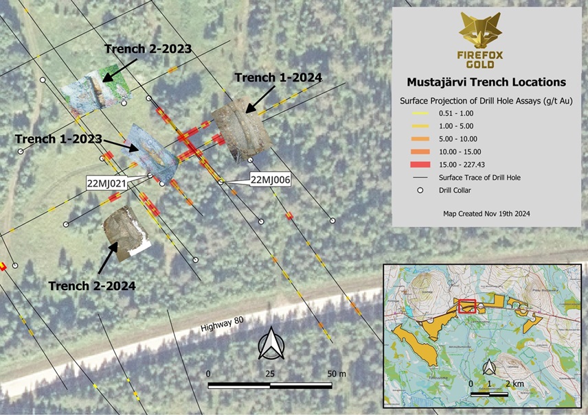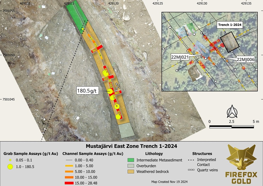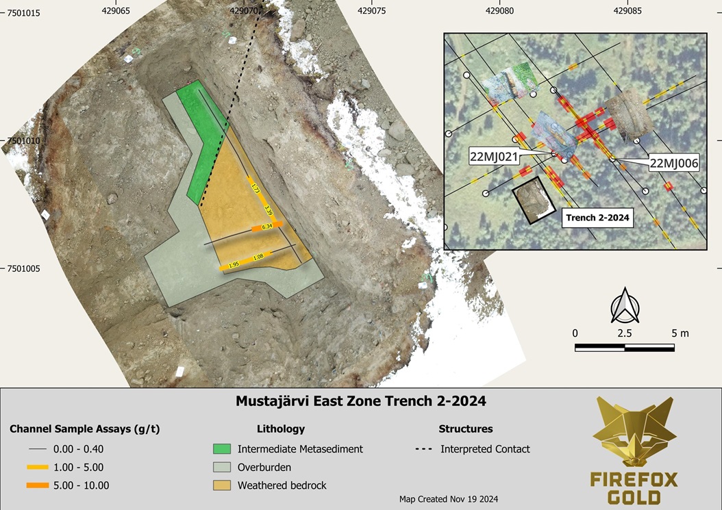 SODANKYLÄ, FINLAND / ACCESSWIRE / November 21, 2024 / FireFox Gold Corp. (TSX.V:FFOX)(OTC-BB:FFOXF)("FireFox" or the "Company") announces the completion of a successful new exploration trenching campaign that has extended surface high-grade gold mineralization at the East Target, within the Company's 100%-held Mustajärvi Gold Project in Lapland, Finland. A new trench at the East Target cut 10.1 metres averaging 13.79 g/t gold. This result builds on the first trench on the target in 2023 that reported bonanza gold grades of 6.87 metres averaging 59.12 g/t gold (see July 27, 2023 news release).