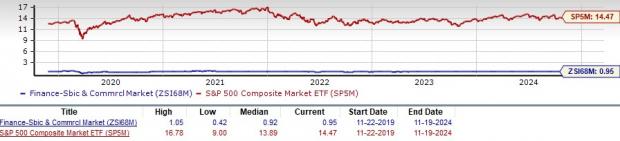 The industry currently has a trailing 12-month P/TB of 0.95X. The highest level of 1.05X, the lowest of 0.42X and a median of 0.92X have been recorded by the industry over the past five years. Also, the industry is trading at a significant discount compared with the market at large, as evidenced by the trailing 12-month P/TB for the S&P 500 composite of 14.47X, as the chart below shows.