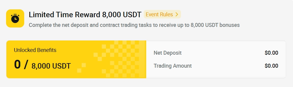 The limited-time challenge is another major highlight of this campaign. Within seven days of registration, users can unlock up to 8000 USDT in Bonus for contract trading by achieving cumulative deposit and trading volume targets. These bonuses can be directly used for contract trading, offering users a low-risk, high-reward opportunity while helping them get acquainted with the platform's high-leverage trading tools.