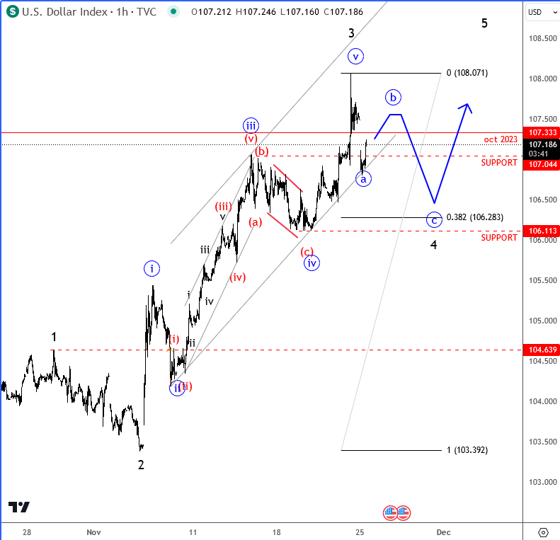 At the start of the week we can see some downside gap in the US dollar across the board, alongside lower US yields. This comes after Trump announced Scott Business as the new US Treasury Secretary, with potential policy actions that could lower yields and interest rates. While these gaps are already being filled, it seems to be a temporary reaction. So after some pause we still will expect more dollar strenght. In fact, a pullback was expected, especially as the Dollar Index moved above its October 2023 highs last week and completed five waves up within wave 3. Therefore, the current correction is likely wave four within an ongoing uptrend.