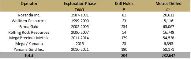 More recently, from 2011 to 2015, Mega Precious Metals held the property and drilled 179 diamond drill holes, focusing on expanding known mineralization and identifying new targets within the project area. In June 2015, Mega Precious Metals was acquired by Yamana Gold Inc. Yamana advanced the project by generating several in-house resource estimates with WSP, and conducted additional drilling, including almost 60,000 metres of drilling in 190 holes, significantly enhancing the project's drilling database.
