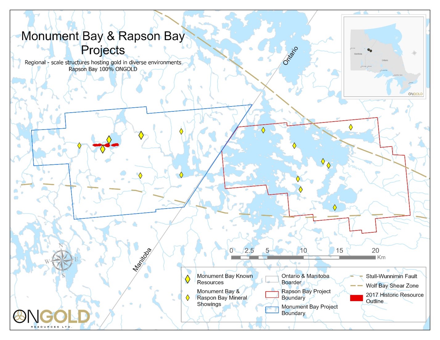 The Monument Bay Property is contiguous to ONGold's Rapson Bay Project in Ontario, which consists of 1,528 cell units covering over 286 km2. This property covers approximately 23 km of the Wolf Bay Shear Zone, a splay from the regional Stull-Wunnummin Fault Zone ("SWFZ"). This shear separates the basalt-dominated Hayes River Group and Oxford Lake Group, which consists mainly of intermediate to felsic volcanics and derived sedimentary rocks. The Gilleran Lake Intrusive is a differentiated mafic intrusion within the Hayes River Group. Several gold, copper and zinc showings are known on the property. Rapson Bay is located approximately 30 km from the camp at Monument Bay, allowing ONGold to utilize the existing camp infrastructure to conduct and expand exploration activities at Rapson Bay.