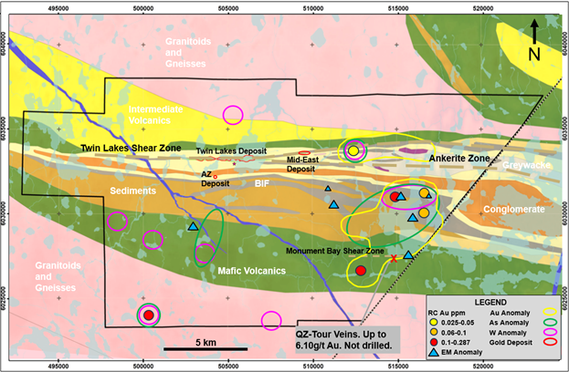 In addition to deposits at Twin Lakes and the AZ and Mid-East Zones, the large Monument Bay property holds many untested targets and offers significant potential for new discoveries. Areas to the east of the Mid-East Zone have similar magnetic signatures as the mafic volcanic unit in the hanging wall of the Twin Lakes Deposit. This area is generally poorly tested by diamond drilling.