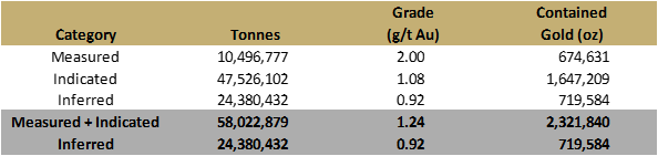 The most recent Technical Report (2017) identified 2.3 million Au oz at an average grade of 1.24 g/t in the Measured & Indicated Mineral Resources categories and 720,000 Au oz at an average grade of 0.92 g/t in the Inferred Mineral Resources category. The mineral resources referenced above are historic and no longer current under NI 43-101. See discussion of, and cautionary disclosure related to, historic resource estimates below.