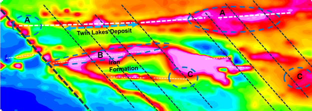Northwest trending features seen in aeromagnetic data appear to control high-grade mineralization in the Twin Lakes Deposit. These same features, interpreted to be faults, cut iron formation units to the southeast, where a decrease in magnetic intensity suggests magnetite-destructive alteration (sulphidization) may be present. Similar magnetic signatures are characteristic of iron formation hosted gold deposits such as the Musselwhite Mine in Northern Ontario operated by Newmont Corporation.