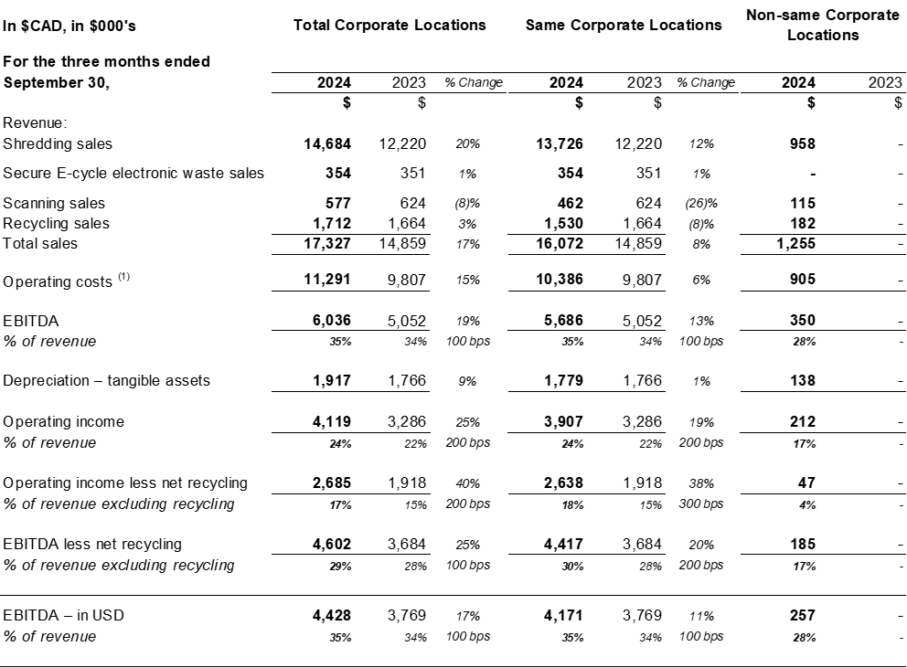 Corporate location EBITDA increased by 19% versus Q3 2023 to $6.0 million CAD (17% constant currency increase) driven by continued growth in shredding sales.