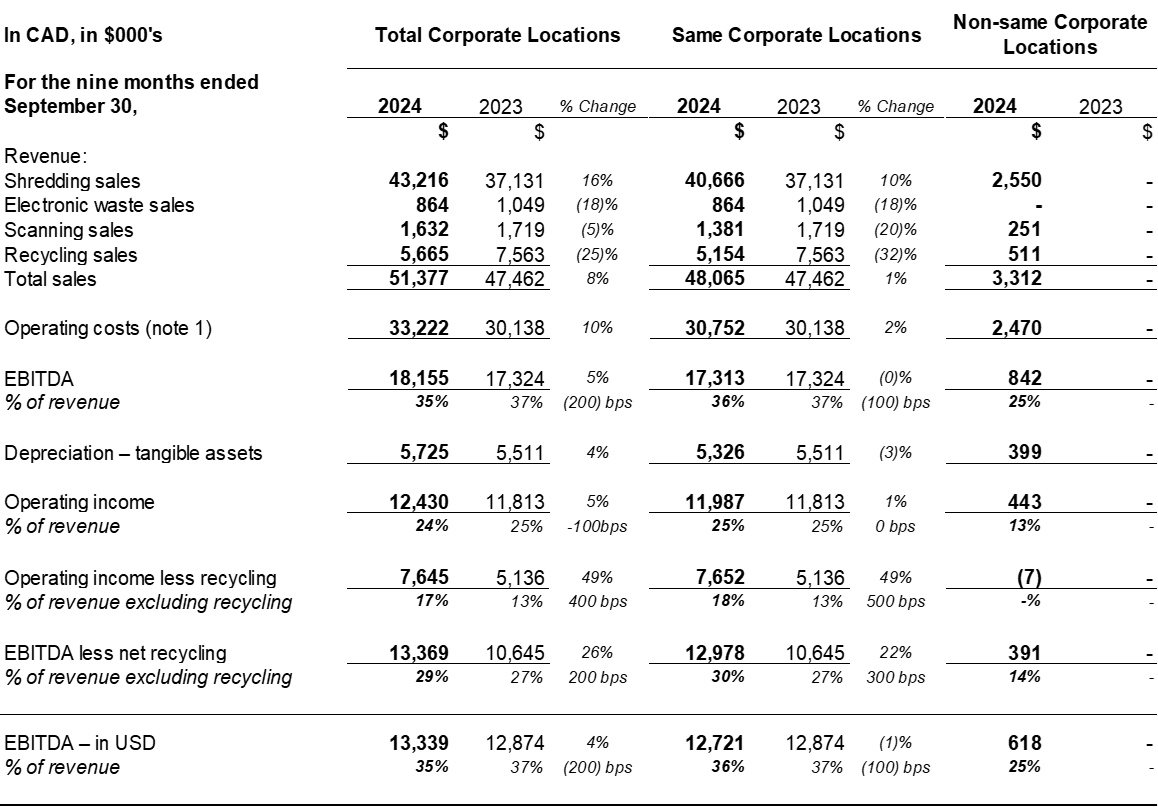 Jeffrey Hasham, the Company's Chief Executive Officer, noted "We are pleased with our financial results in the third quarter of 2024, with EBITDA of $4.1 million Canadian. When we look at EBITDA less net recycling revenue, this increased to $2.7 million Canadian compared to $1.7 million Canadian in Q3 2023, highlighting the strength in our core operating business. From a revenue perspective, we continue to see demand in our service offerings with top-line revenue growth of 16%, including 12% organic shredding revenue growth, versus Q3 2023.