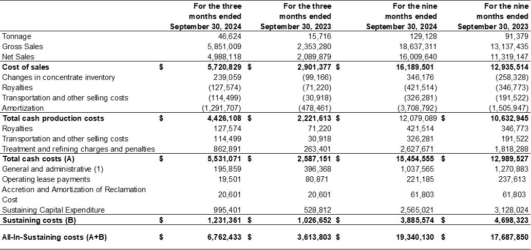 To improve the accuracy and presentation of AISC calculations, Silver X refined the composition of General & Administrative Expense in sustaining cost, excluding discretionary costs for business development, investor relations and share-based compensation. For comparative purposes the prior period were also recalculated based on the revised methodology, resulting in AISC of $26.2 for the three months period ending September 30, 2024, compared to $37.9 for the same period in 2023 (30.7% decrease) and $23.0 for the nine months period ending September 30, 2024, compared to $28.2 for the same period in 2023 (18.4% decrease).