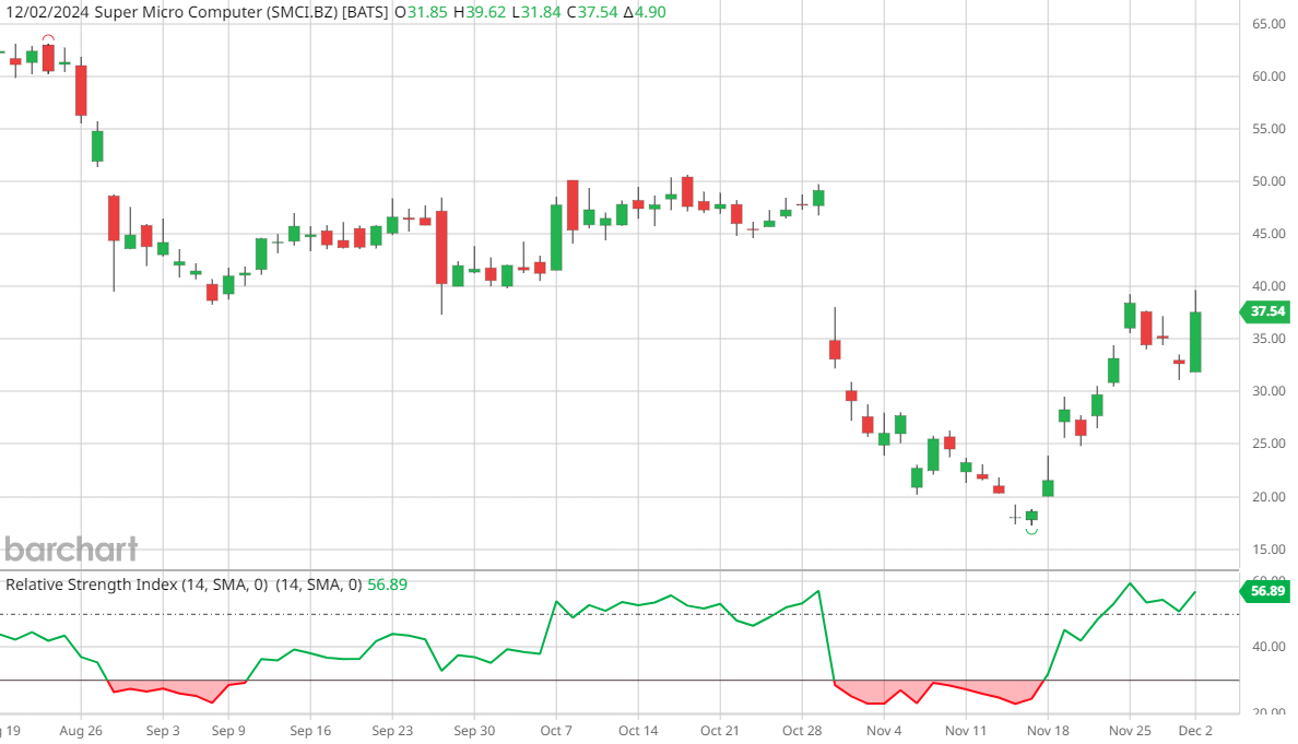 SMCI has spent the past couple of weeks working its way out of deeply oversold status, and has rallied more than 113% from its mid-November lows. However, the wildly volatile stock is still down about 70% from its March highs.