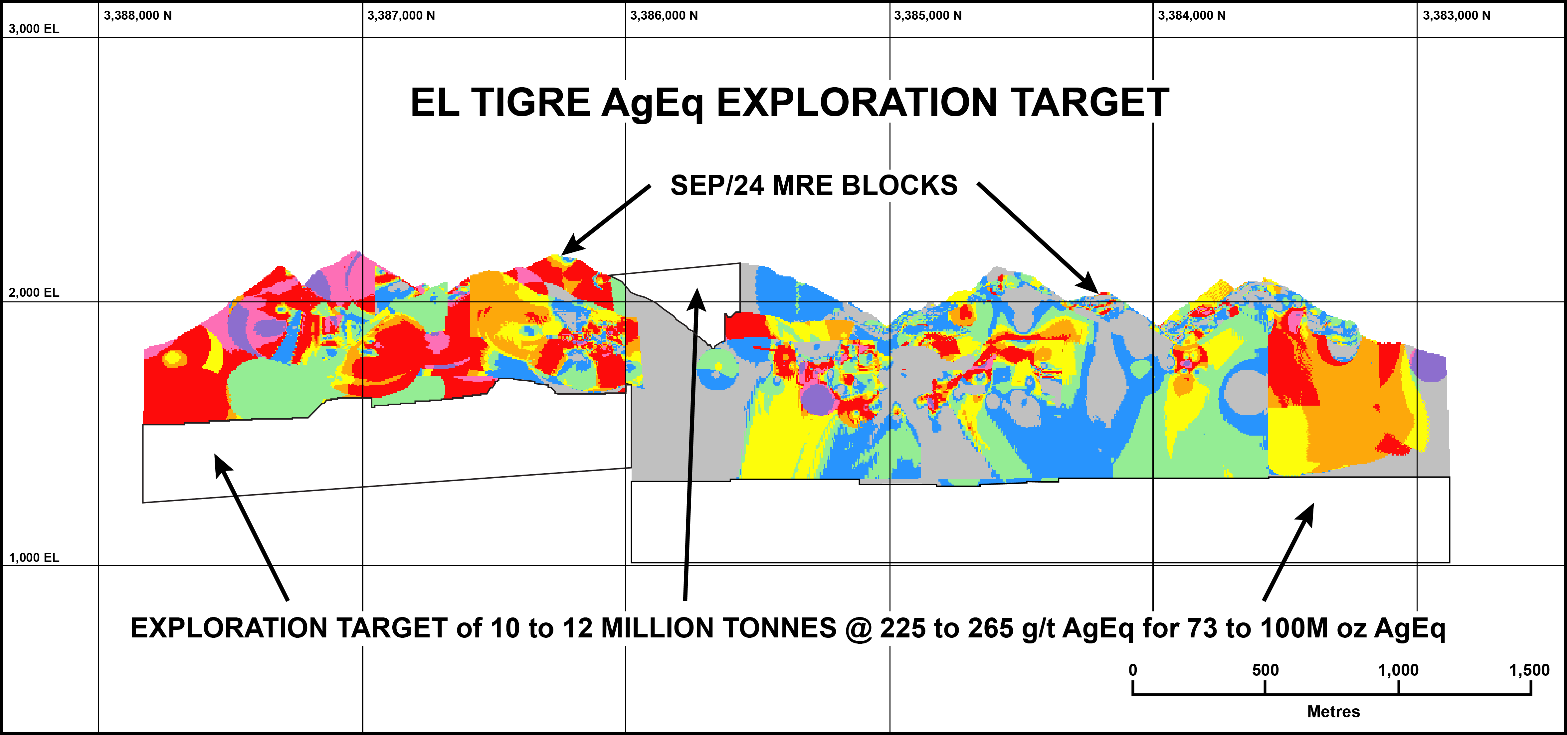 Exploration potential at the El Tigre Project is substantial with prospective areas for exploration both down dip and along strike with the disclosed Exploration Target establishing 10 to 12 million tonnes at 225 to 265 g/t AgEq for 73 to 100 Moz AgEq.