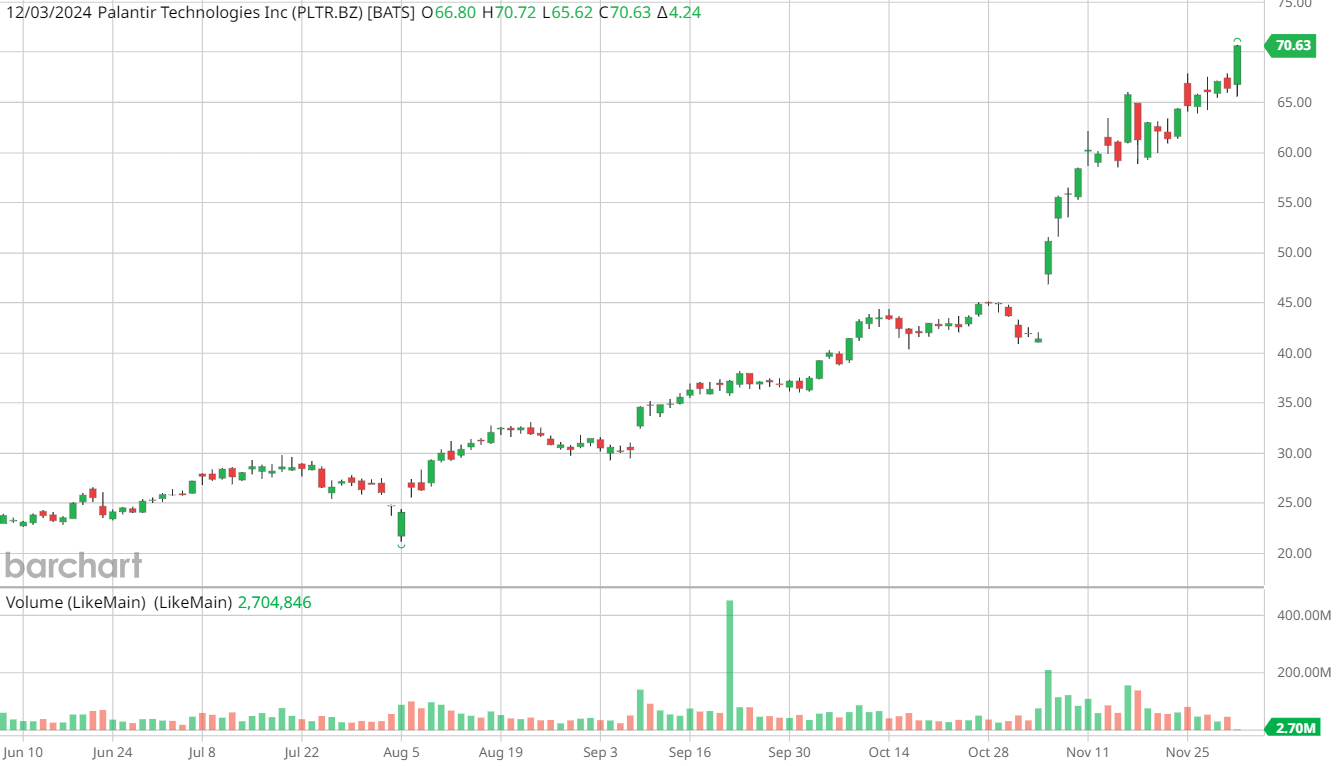 Palantir Technologies (PLTR) is trading at new highs above $70 today, up more than 5% after securing the FedRAMP High Authorization, which enables it to offer cloud services to U.S. government agencies with highly sensitive data. This authorization is expected to enhance Palantir's ability to secure more government contracts, potentially boosting its revenue.