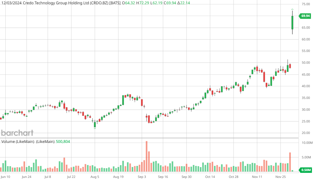 Semiconductor stock Credo Technology Group (CRDO) is breaking out big today, up 45% this afternoon to trade at new all-time highs after last night's fiscal second-quarter earnings report. CRDO stock is now up 259% on a year-to-date basis, and earlier soared to a new record high of $72.30.