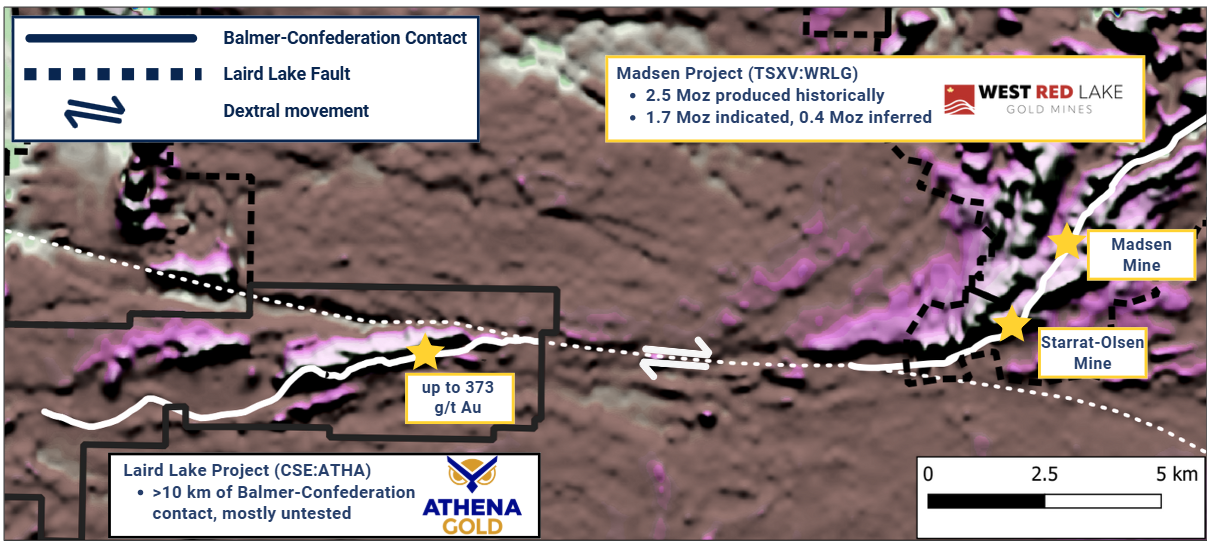 "Laird Lake continues to impress. Our sample returning 373 g/t Au represents the highest-grade grab sample ever taken at the project and, to our knowledge, is amongst the highest-grade surface grab samples publicly reported in the Red Lake Gold District. With more than 10 km of Balmer-Confederation contact to explore and high-grade, visible gold showings scattered throughout, we believe we might be on the cusp of the next major gold discovery in Red Lake," stated John Power, President & CEO of Athena Gold.