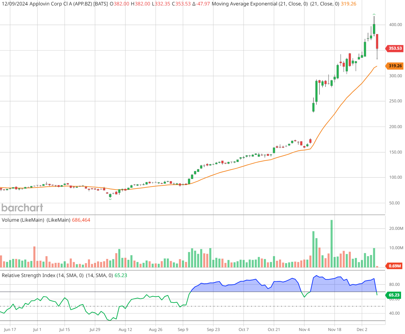 The shares are also working their way out of a short-term overbought status, with the 14-day Relative Strength Index (RSI) now below 70 - though APP still trades well above its 21-day exponential moving average (EMA).
