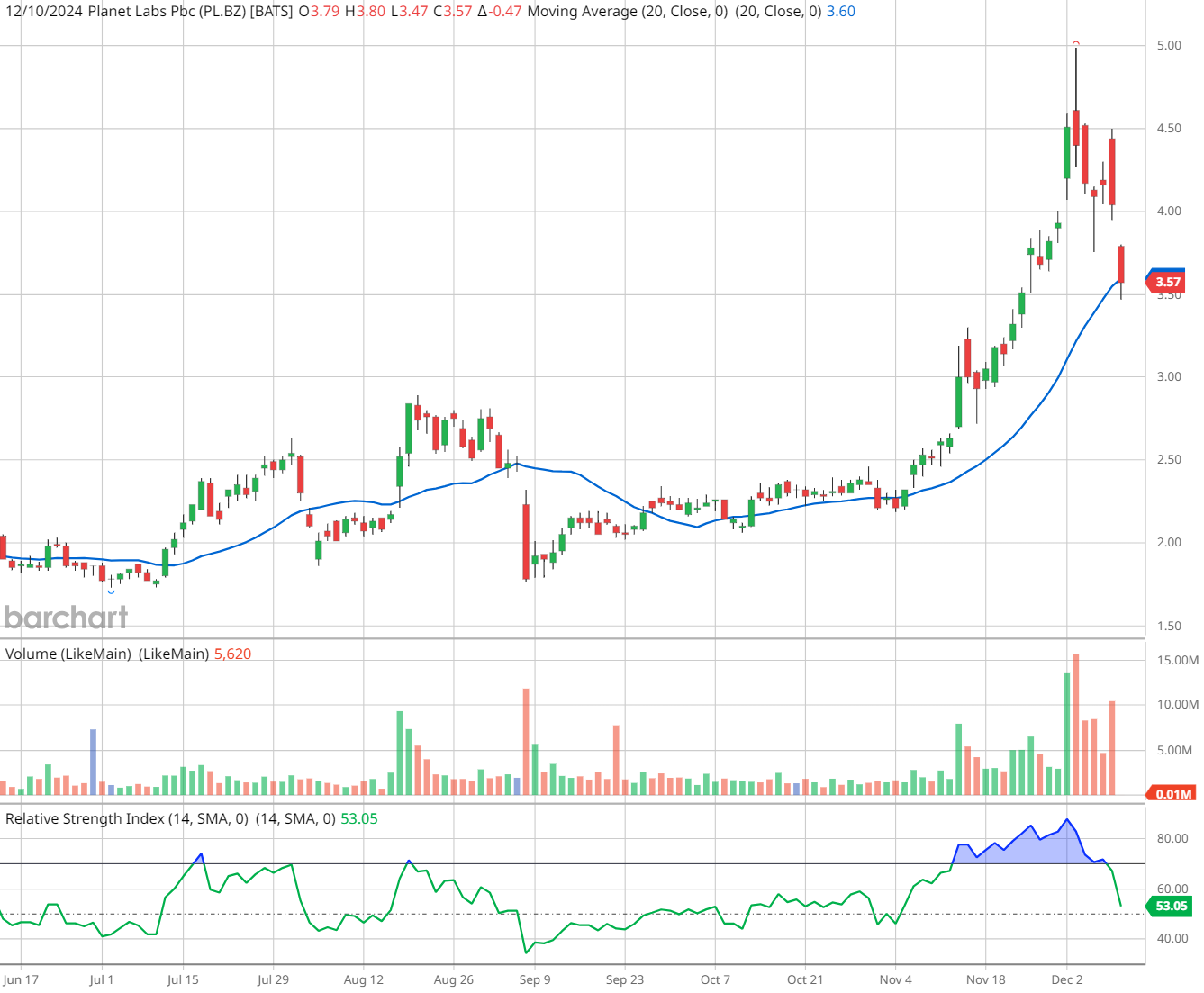 Satellite imagery specialist Planet Labs (PL) reported its third-quarter earnings last night, which has the stock on pace to open 11% lower this morning as investors react to the news. The company reported a Q3 adjusted loss per share of $0.02, which beat expectations, while revenue increased 10.7% from the previous year to $61.3 million.