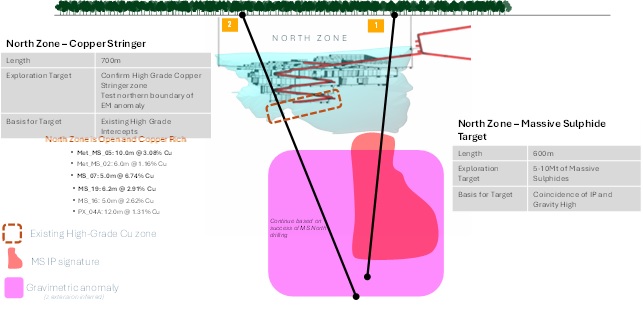 Recent drilling based on gravity survey results suggest the potential discovery of a new copper-rich zone, located West and below the North Zone Primary Massive Sulphide domain (assays pending, see figure below).