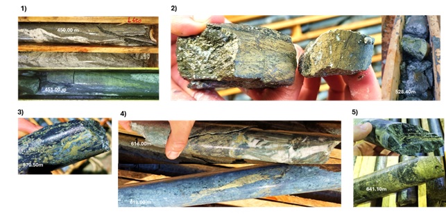 Chalcopyrite bearing Zones: Based upon visual review Stringer mineralization intersected between 449.50m and 454.30m depth showcased significant chalcopyrite, accompanied by traces of galena, confirming the presence of robust copper mineralization.