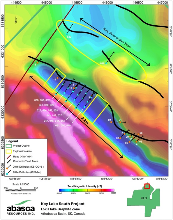 SASKATOON, SK / ACCESSWIRE / December 11, 2024 / Abasca Resources Inc. ("Abasca" or the "Company") (TSXV:ABA.VN) is pleased to announce its 2025 Winter Program plan at its 100% owned Key Lake South Project (KLS), which includes approximately 5,000 metres of drilling to expand on the summer program's successful results (Figure 1). The drilling will continue at a 100 m x 100 m grid spacing to demonstrate the strike- and depth-extent of the Loki Flake Graphite Zone ("Loki Zone"). The Company will also begin collecting field data for environmental baseline and hydrological studies.