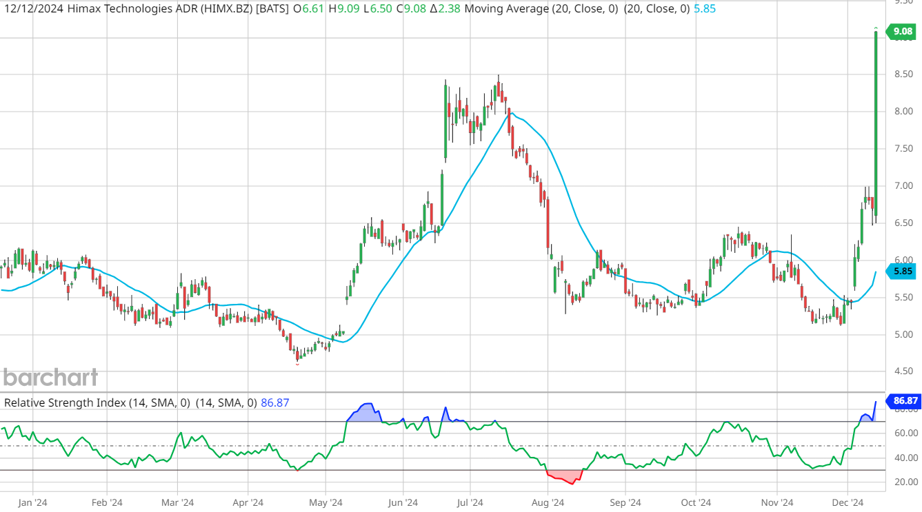 Today’s price spike is occurring on heavy volume of over 11 million shares, compared to the stock’s daily average of fewer than 1.5 million. The breakout in HIMX today has been triggered by an analyst report suggesting the semiconductor stock is set to join the supply chain for artificial intelligence (AI) heavyweights Nvidia (NVDA) and Taiwan Semiconductor (TSM).