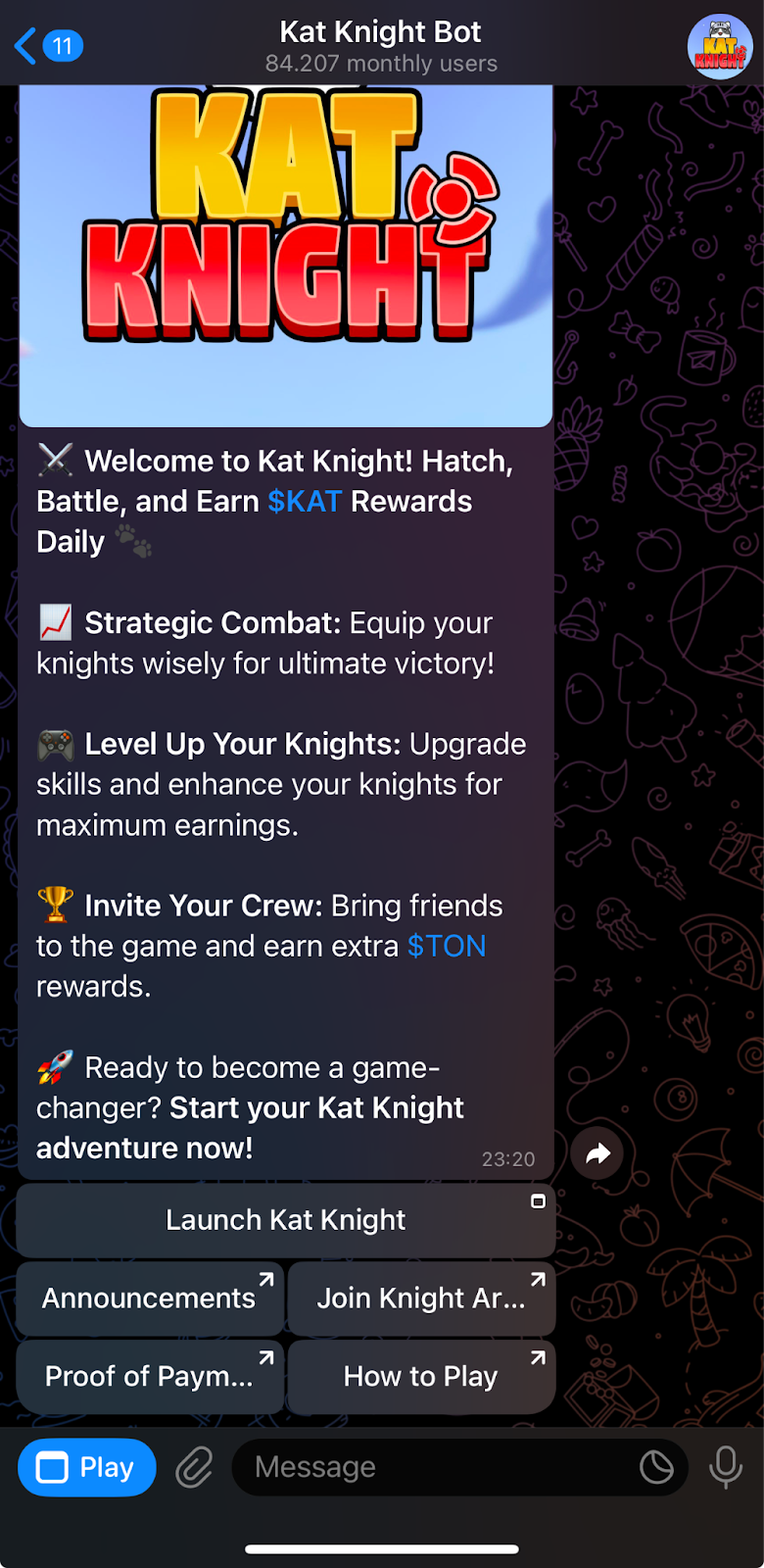 - Click the link: https://t.me/katknight_bot and select Play to enter the game.