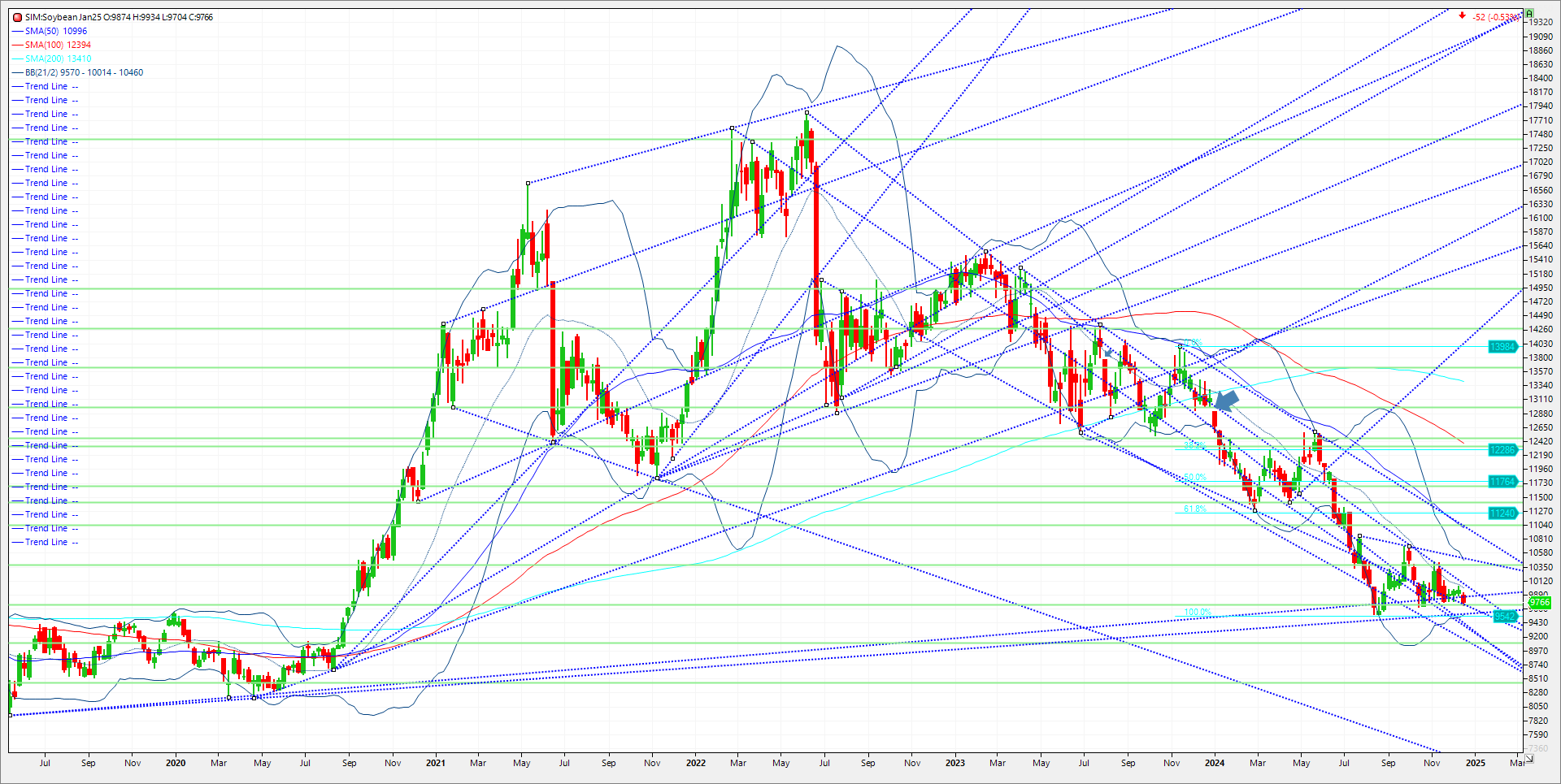 Soybeans were pressured overnight and throughout most of the session on two fronts in my opinion. First, Reuters is reporting that an upcoming U.S. government funding bill will include a provision for year-round E15 sales, according to sources; they are currently effectively blocked from June to September. This in my view is seen as bearish as concerns mount on how or whether soybean oil qualifies for 45Ztax credits. Second issue is the Brazilian Real continues to move to all-time weakest levels vs the US dollar; with concerns of spiraling inflation and economic uncertainty triggering the collapse in my opinion. This is driving up the revenues for the Brazilian grower who continues to sell as crop prospects remain very favorable. Despite the USDA announcing two flash sale announcements, 132K of beans into Uknown for future shipment and 187K to Spain. The trade will view the sale into Spain as front loaded before any potential tariffs that maybe forthcoming. The growing weather in Brazil is optimal currently in the big growing areas, where rains are widespread with big totals. The bean market is hanging onto its fingernails just above support. January 25 beans is still the most actively traded contract until next week. For the remainder of the week focus on January soybeans. Support is just below todays close at 968 to 972. A close under and its 958 and then 951. Resistance is 9.86. A close over and we could trade back to 10.06/08.