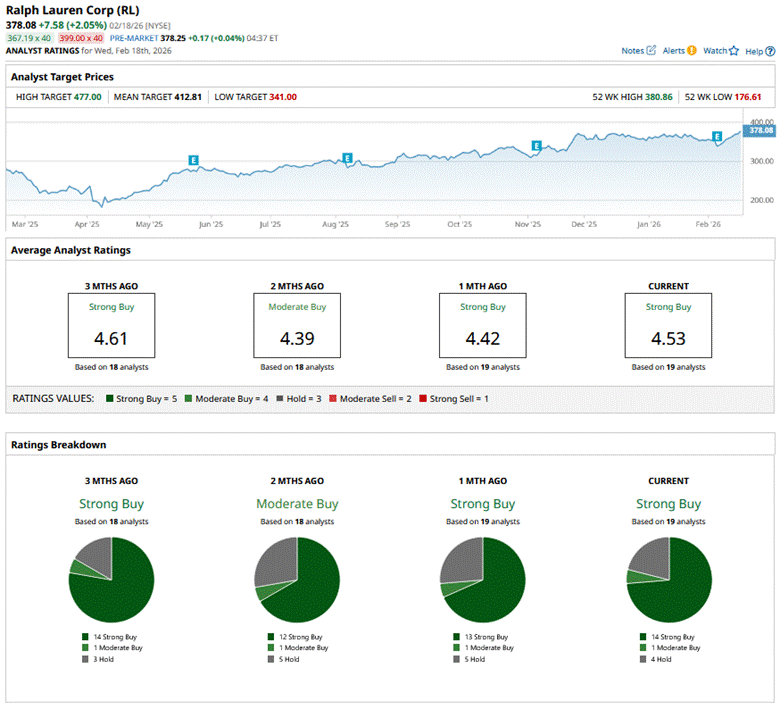 On Feb. 6, Jefferies analyst Blake Anderson maintained a "Buy" rating on Ralph Lauren and lowered its price target from $425 to $410. The mean price target of $412.81 indicates a 9.2% premium to RL’s current price levels. Its Street-high target of $477 suggests a 26.2% potential upside.