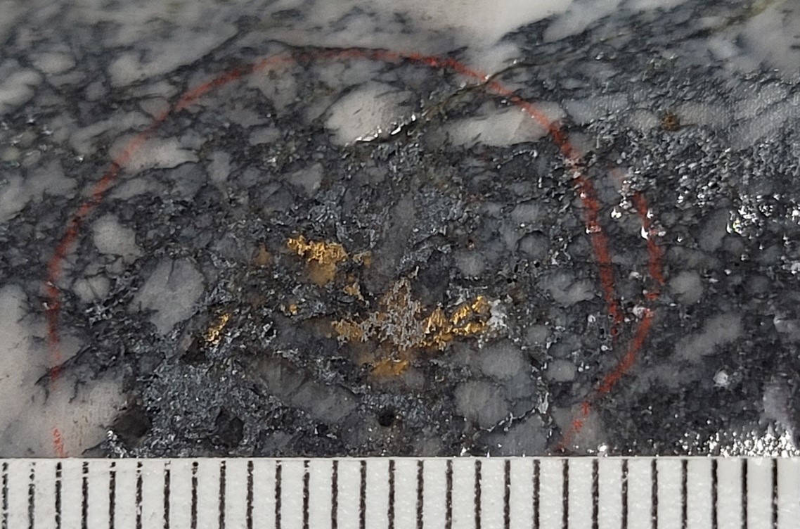 Picture 1: Quartz stibnite vein with coarse visible gold at 751.9 m. Interval assayed 0.4 m @ 754 g/t Au and 11.4% Sb from 751.9 m. Scale 1mm markings.