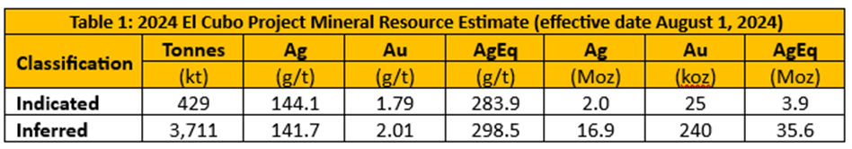 The 2024 MRE comprises Indicated Mineral Resources of 3.9 million troy ounces (Moz) AgEq9 at 283.9 g/t AgEq9 within 429 thousand tonnes (kt), and Inferred Mineral Resources of 35.6 Moz AgEq9 at 298.5 g/t AgEq9 within 3,711 kt. Table 1 presents the complete 2024 El Cubo MRE statement.