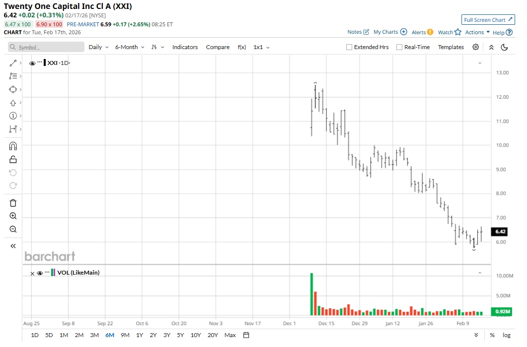 After listing in December 2025 at $11.42, XXI stock has been in a downtrend and is currently lower by 43.8%. This correction has been in sync with a sharp correction in Bitcoin for the year.