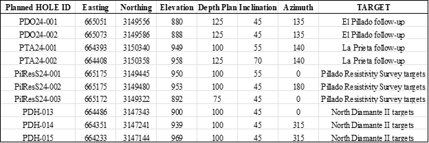 Colibri (operator) and Silver Spruce completed the first-ever drill program on Diamante at the El Pillado and La Prieta targets located on Diamante 1. Results from the 2022 drilling include 2.48 grams per tonne ("g/t") Au and 56.7 g/t Ag over an intersection length of 9.0 metres ("m") from La Prieta and 0.26 g/t Au and 184.5 g/t Ag over an intersection length of 6.0 m from El Pillado. Drilling at both targets intersected highly anomalous base metals in highlighted drill assay intervals. Through the fall of 2023, Colibri and Silver Spruce completed a program of geological mapping, rock sampling and stream sediment sampling on Diamante resulting in the discovery of two new surface showings (see Colibri press release January 9, 2024). The prioritization of targets and drill plan for the 2024 program at Diamante was based on this work combined with comprehensive compilation and interpretation of historical exploration information.