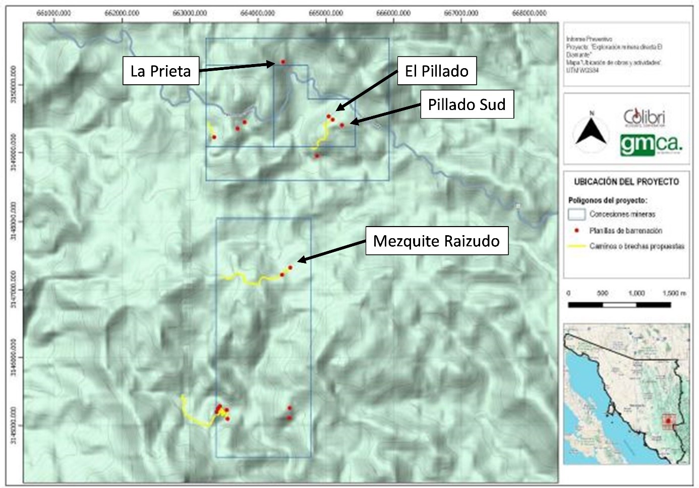 Two holes were drilled at each of El Pillado and La Prieta zones to follow up on previous positive drill results. Two holes were drilled to test the results of an electrical (resistivity) survey covering part of an extensive color anomaly located immediately south of El Pillado zone. One hole was drilled to explore Mezquite-Raizudo target area located approximately 2.3 km south-southwest of El Pillado.