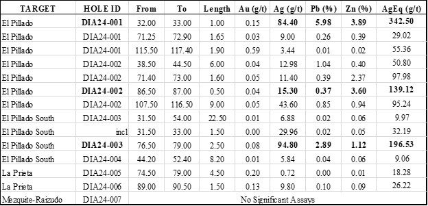 The 2024 drilling at El Pillado was planned to intersect a northeasterly trend of mineralization evident in the 2022 drilling. Both holes drilled in the 2024 program intersected multiple mineralized intervals indicated by the occurrence of fault rocks hosting vein quartz with or without galena, sphalerite, or pyrite and sericite alteration. Significant intercepts from 2024 El Pillado, El Pillado South and Mezquite-Raizudo areas drilling are contained in Table 2.