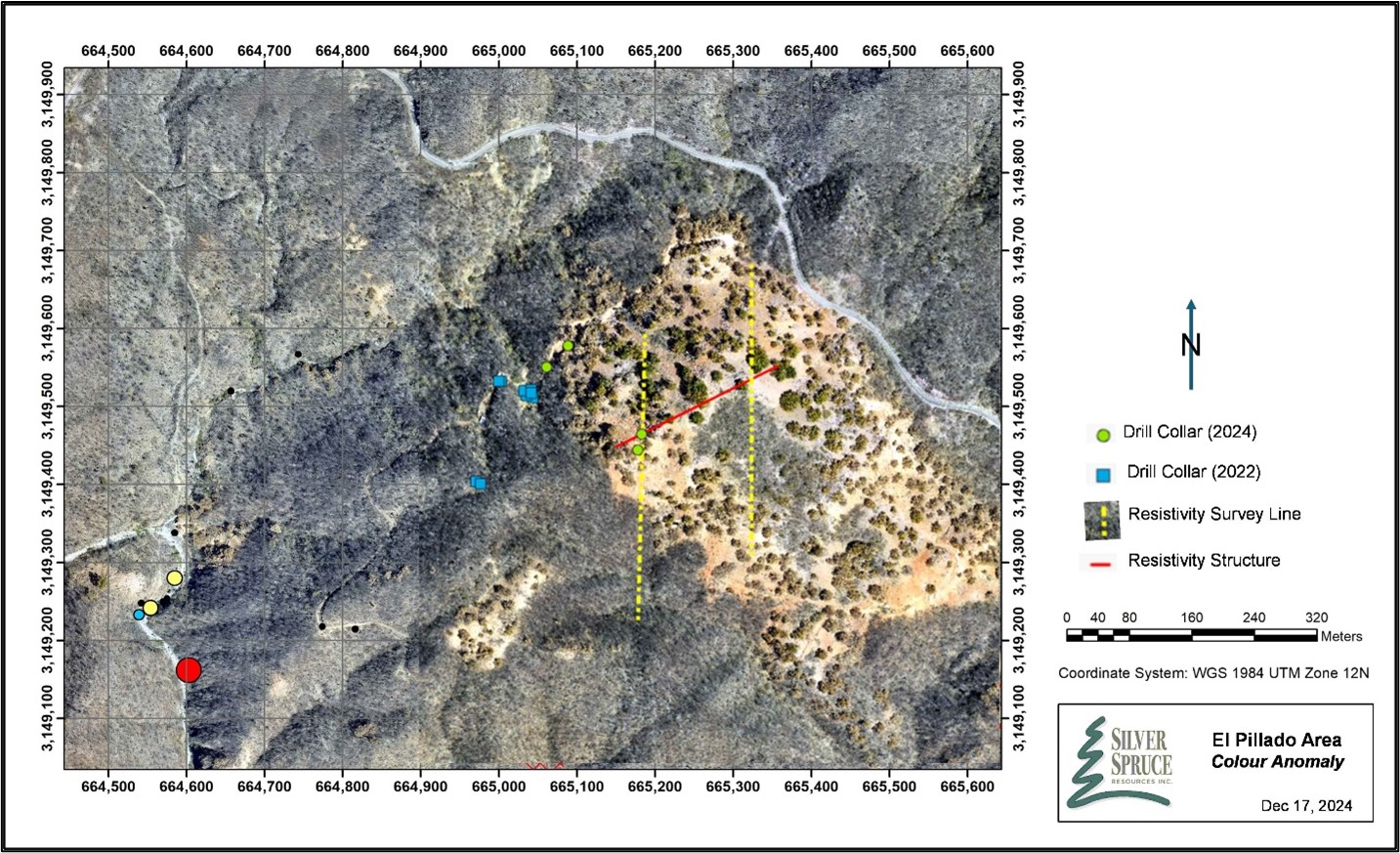 Greg Davison, Silver Spruce Vice-President Exploration and Director stated, "We were pleased to identify Ag-Pb-Zn±Au vein-controlled mineralization within extensions to the previously drilled areas at La Prieta and El Pillado and two new opportunities for widening the target testing at El Pillado South and Mezquite-Raizudo based on the geological and geophysical interpretations and look forward to expanding future ground exploration of other known anomalous areas."